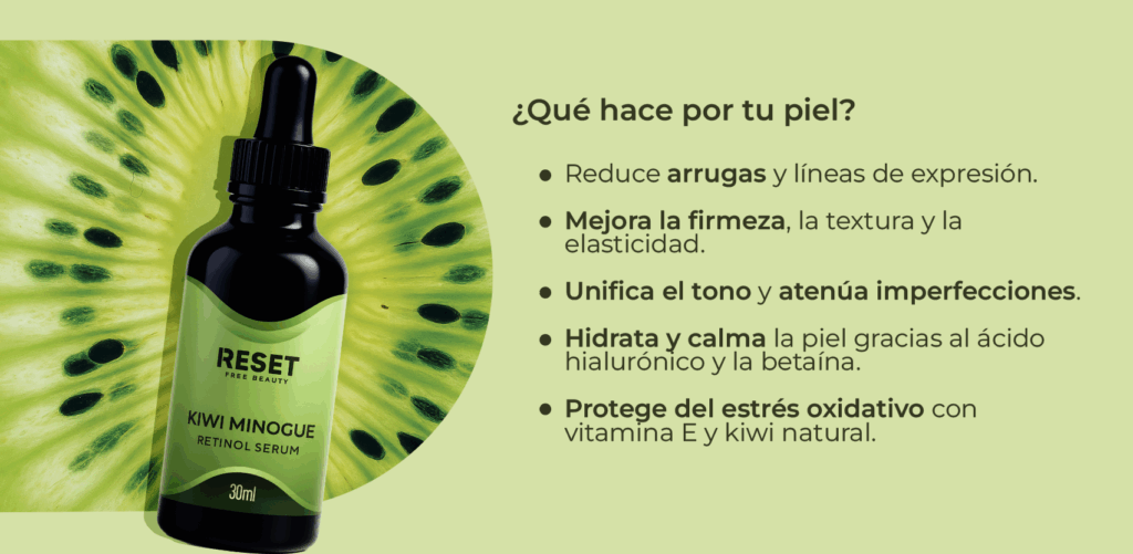 Descubre cómo Kiwi Minogue– Serum Retinol combina ciencia y naturaleza para renovar, reafirmar e iluminar la piel sin irritarla. Retinol avanzado, hidratación profunda y resultados visibles desde las primeras semanas.